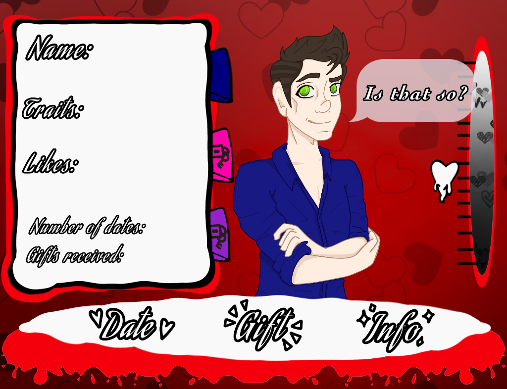 Love Sucks is a parody dating simulator based around the romanticism of vampires. First made in Processing, this game started as an assignment to get used to coding a working game. There are three vampires available to date: Sarah, Bella and Stephen. Each vampire has their own tastes and desires that will be hinted at to the player in order to gain affection and hopefully score a date!